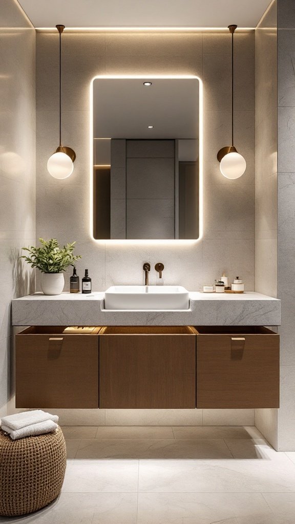Backlit mirrors can really enhance your bathroom’s vibe. They provide a modern, sleek look while also offering great lighting for your daily routine. These mirrors not only brighten the space but also add a touch of elegance that feels high-tech and fresh.